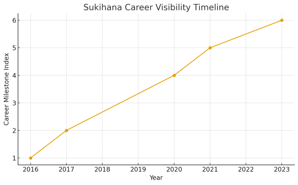 Below is the representation of Sukihana’s rise in visibility throughout her career, using a simplified milestone index that shows how her public profile expanded from 2016 to 2023. While not a measurement of earnings directly, the upward trajectory aligns closely with key moments in her life and professional journey—moments that also contributed to her net worth growth